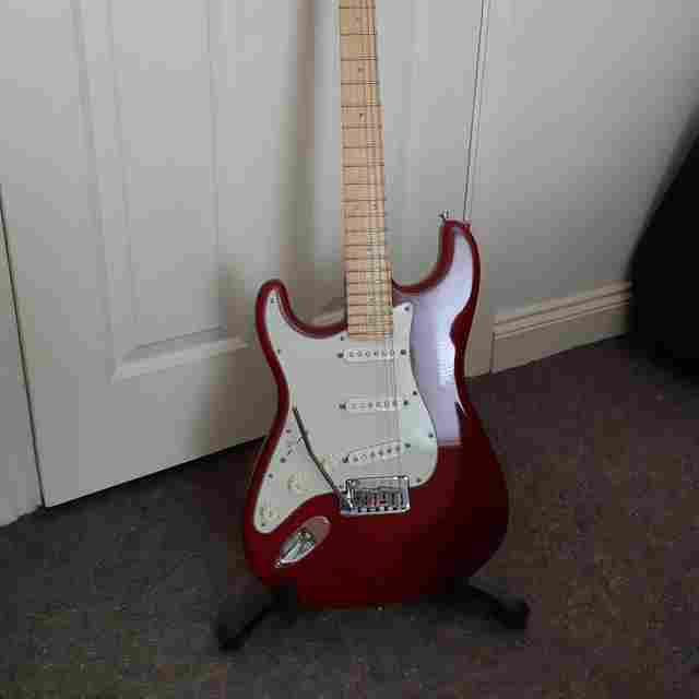 Left handed USA Fender Stratocaster Deluxe Guitar with Shaller locking tuners. Chrome Red in mint condition with custom case + extras. Practice use only. Reluctant sale. Collection...