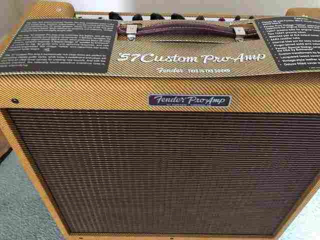 Fender 57 Custom Pro - 26 watt guitar combo amp, tweed covered pine, 1x15” Eminence special design speaker, 1 normal volume, 1 bright volume, 4 inputs (2 high/2 low), Bass, treble, presence controls, 6L6 power tubes, 5AR4 rectifier tube, 2 12AX7 tubes and 1 AY7 pre amp tube, dust cover. In excellent shape!